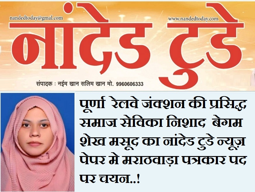 महाराष्ट्र राज्य नांदेड़ ज़िले का प्रसिद्ध नांदेड़ टुडे हिंदी न्यूज़ पेपर एंव यूटुब चैनल,इंस्ट्राग्राम पेज और नांदेड टुडे फेसबुक पेज के माध्यम से जनता की समासियों का समाधान करने और अपने उत्कृष्ट कार्य से जाने जानेवाले न्यूज़ पेपर में पूर्णा रेलवे जंक्शन की प्रसिद्ध समाज सेविका निशाद बेगम शेख मसूद का नांदेड टुडे न्यूज़ पेपर मे मराठवाड़ा पत्रकार पद पर चयन किया गया है !